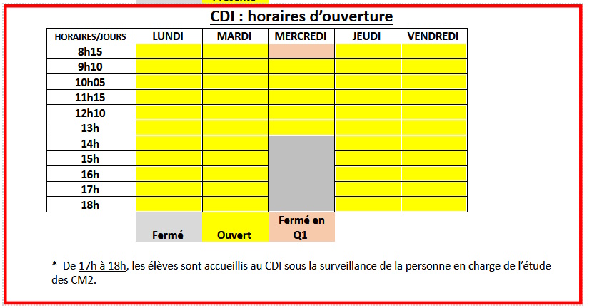 Mesdames KATSIKAS et PRUDHOMME accueillent les élèves et l'ensemble du personnel 5 jours par semaine. Le CDI est un lieu de travail et d'apprentissage vaste et agréable qui est accessible directement depuis la cour de l’établissement avec une capacité de 140 personnes en places assises, dans un espace de 300 m², divisée en 5 zones distinctes : - une zone de travail sur table dédiée aux collègiens - une zone de lecture loisir équipée de canapés disposés autour des bacs de BD.